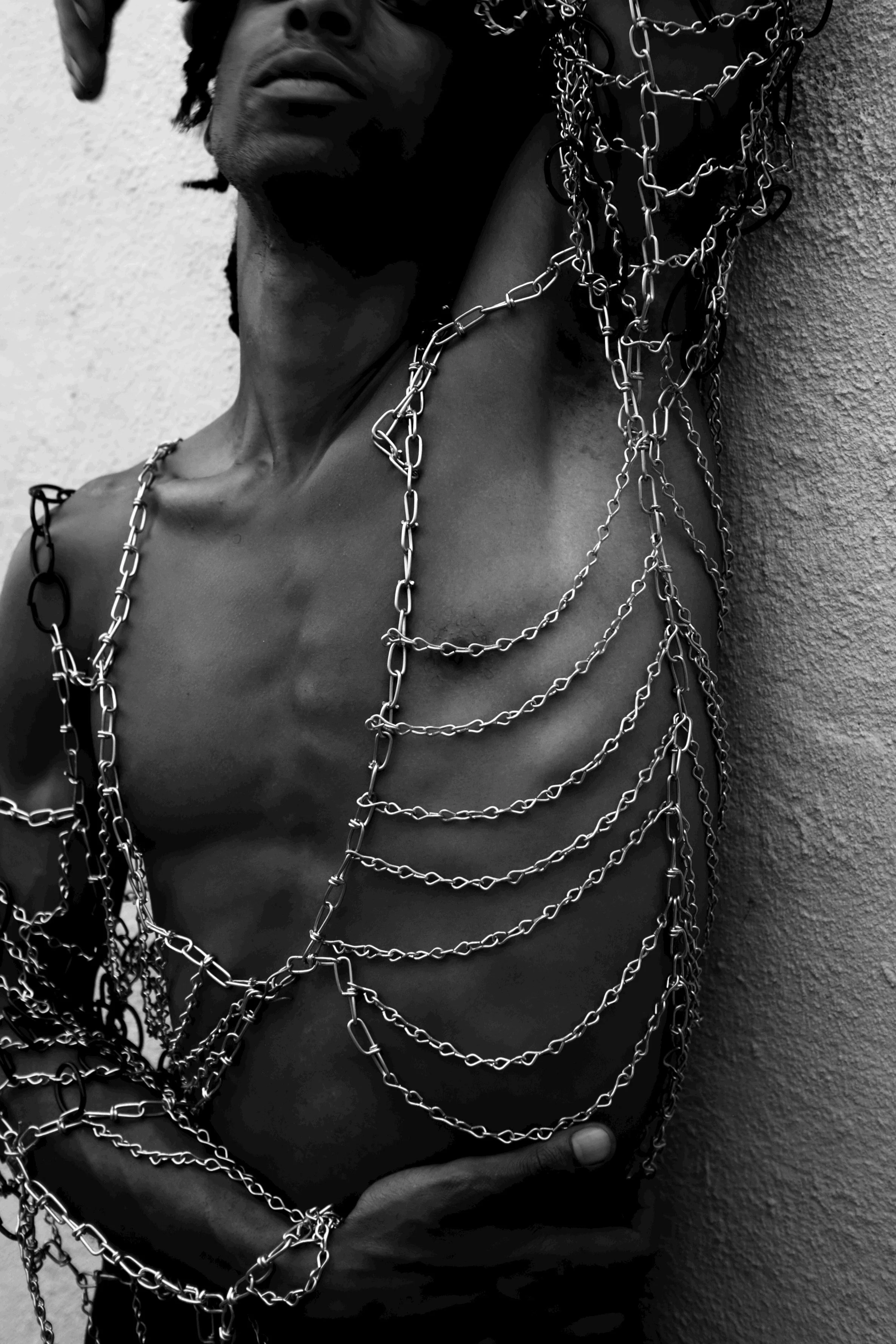 wearable emotion chain link jacket , 2019 intertwined birds Nickel arm band , 2021 Nickel hollow form ring with found shell 2021